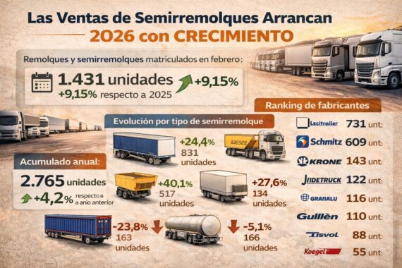 El mercado de remolques y semirremolques en España ha iniciado 2026 con una evolución positiva. Tras un comienzo prácticamente plano en enero, las matriculaciones registradas en febrero muestran un repunte significativo que confirma la buena dinámica del sector del transporte y la logística. Este crecimiento refleja la continuidad del ciclo […]